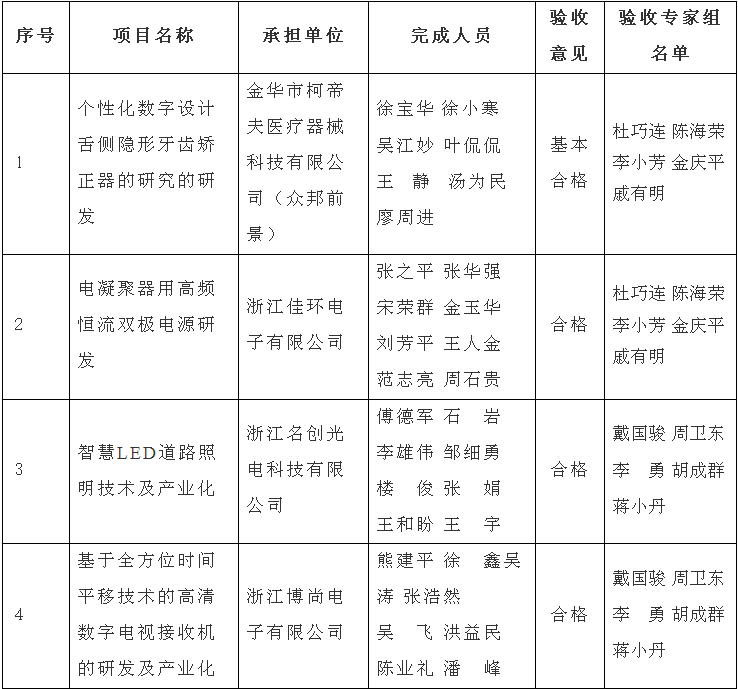 根據(jù)《金華市級科技計劃項目驗收管理辦法》(金市科字〔2015〕83號)規(guī)定,現(xiàn)將金華市柯帝夫醫(yī)療器械科技有限公司(眾邦前景)、浙江佳環(huán)電子有限公司、浙江名創(chuàng)光電科技有限公司、浙江博尚電子有限公司承擔的《個性化數(shù)字設計舌側隱形牙齒矯正器的研究的研發(fā)》、《電凝聚器用高頻恒流雙極電源研發(fā)》、《智慧LED道路照明技術及產(chǎn)業(yè)化》和《基于全方位時間平移技術的高清數(shù)字電視接收機的研發(fā)及產(chǎn)業(yè)化》4個市級科技計劃項目驗收結果予以公示,接受社會監(jiān)督,公示期從2018年1月10日至1月17日止。