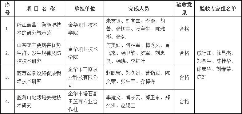 根據《金華市級科技計劃項目驗收管理辦法》(金市科字〔2015〕83號)規(guī)定,現將金華職業(yè)技術學院承擔的《浙江藍莓平衡施肥技術的研究與示范》等市級科技計劃項目驗收結果予以公示,接受社會監(jiān)督,公示期從2018年7月17日至2018年7月24日止。任何單位和個人對驗收意見持有異議的,應當在公示期內書面向市科技局提出異議,單位應采用書面形式并加蓋公章,個人應采用實名提出異議。