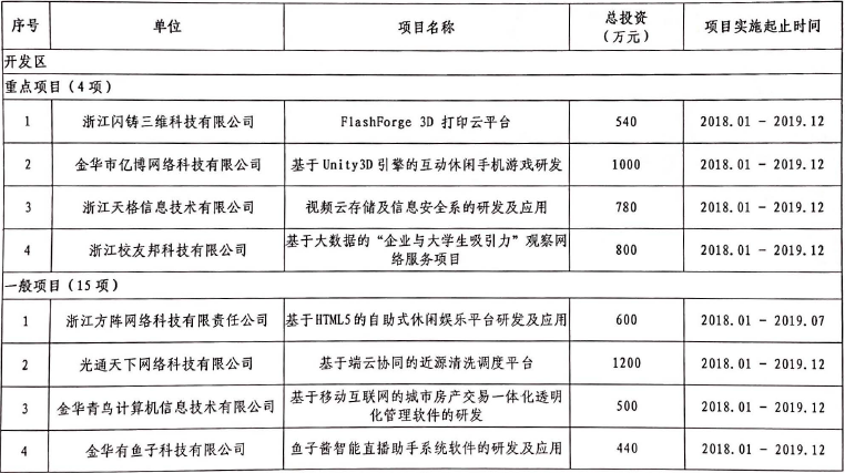 件和信息服務產業(yè)基地能力提升工作的通知)) (浙經信軟件(2018) 53 號)、《浙江省工業(yè)和信息化發(fā)展財政專項資金使用管理暫行辦法)) (浙財企(2014) 189 號)以及《關于做好2018 年省軟件和信息服務產業(yè)基地能力提升專項資金項目的通知)) (金網經發(fā)(2018) 13 號)文件精神,經申報單位自主申報,金華開發(fā)區(qū)網絡經濟局推薦上報,市網絡經濟局根據(jù)省財政專項扶持資金支持重點方向,組織專家對區(qū)推薦上報的項目從項目實施內容、項目技術創(chuàng)新、項目市場前景、項目經濟和社會效益等方面進行了綜合評審并經公示、復核,確定浙江閃鑄三維科技有限公司"FlashForge 3D 打印云平臺"等19個項目入選2018年省軟件和信息服務產業(yè)基地能力提升專項資金項目計劃,其中重點項目4 個、一般項目15 個,現(xiàn)印發(fā)給你們。建議重點項目扶持資金額按高于一般項目扶持資金額30%左右安排。請你們參照《浙江省信息服務業(yè)發(fā)展專項資金項目驗收管理暫行辦法)) (浙經信軟件(2011) 601 號)要求,及時通知各項目承擔單位簽訂項目合同書,并會同區(qū)財政部門做好資金落實、業(yè)務指導和監(jiān)督檢查工作。