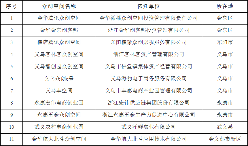 根據(jù)《金華市眾創(chuàng)空間管理辦法(試行)》(金市科〔2016〕70號(hào))規(guī)定,經(jīng)研究,同意金華騰訊眾創(chuàng)空間等11家單位備案為金華市眾創(chuàng)空間。